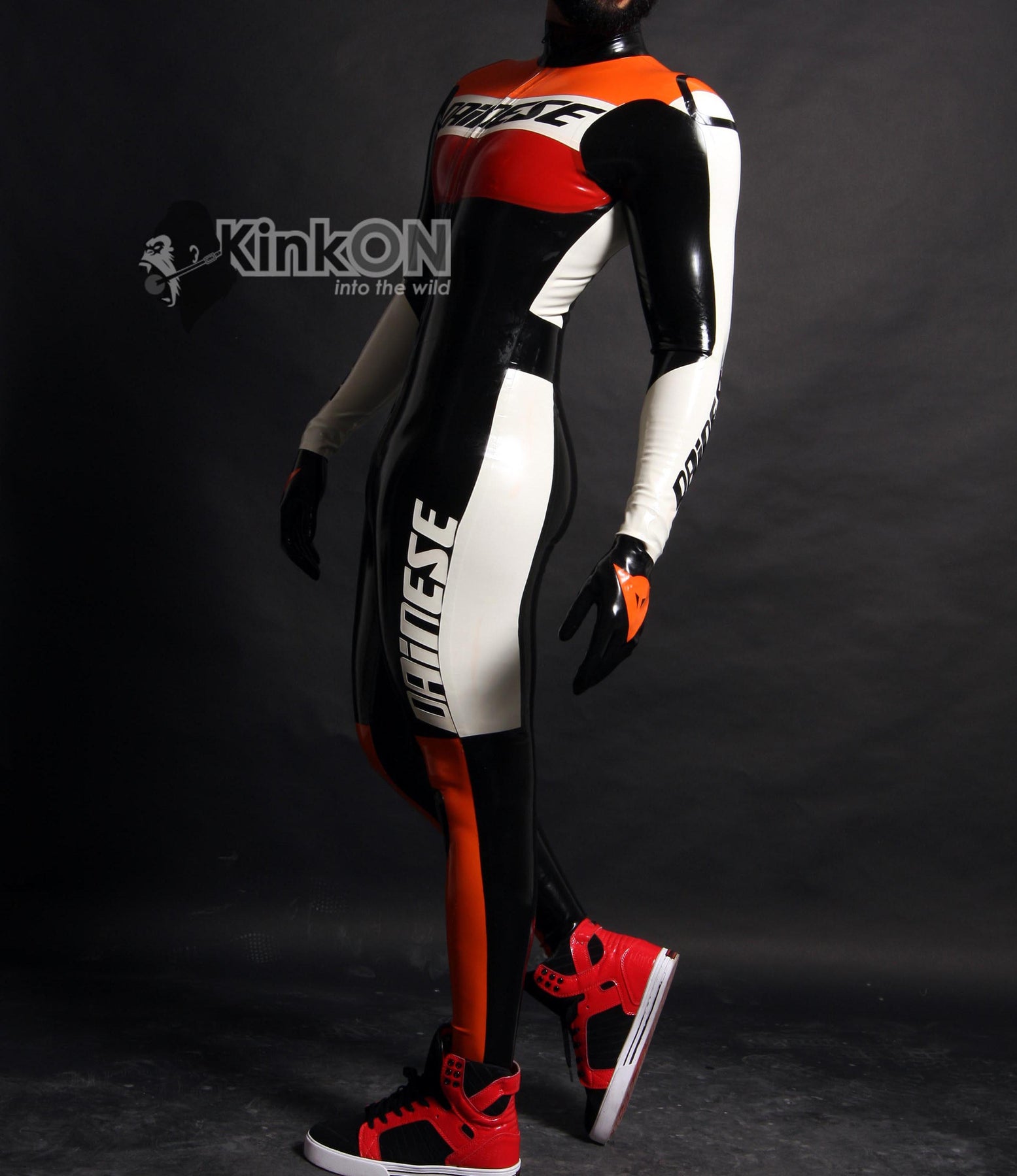 Moto suit with logo on front and back (word is customizable)Logo on gloves and details on knees.